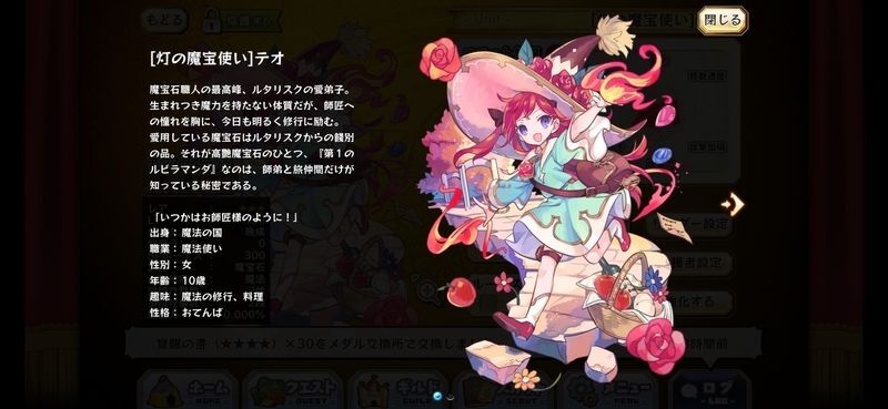| 進化後:「灯の魔宝使い」テオ Lv50以上の★3テオがパーティに入っている状態で、第二部メインクエスト「西部の国」の「幕間:もう一つのルール」をクリア:一定の確率でテオが進化 | |