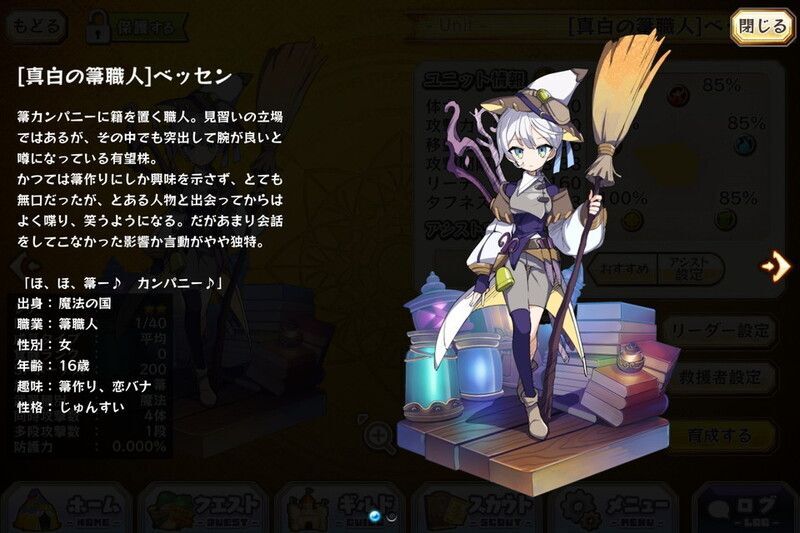 | 進化後:「純恋の箒工」ベッセン ・Lv40以上の★2ベッセンが出撃パーティに入っている状態で、「幕間の劇場、欠片の小篇4th」のマギャウト出現クエストをクリアすると一定の確率で進化 | |