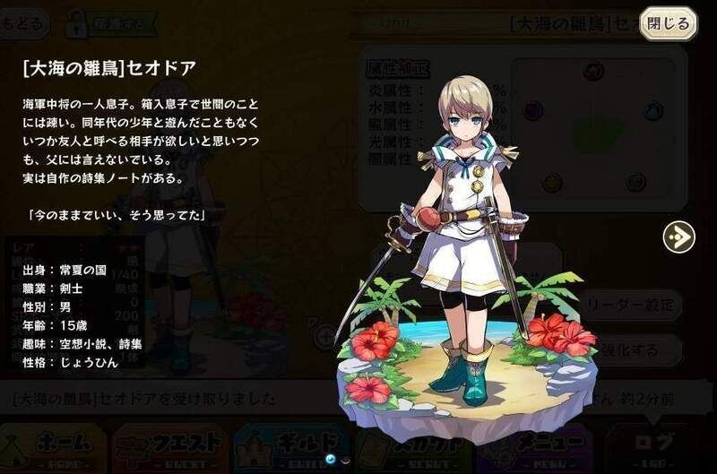 | 進化後:「碧泳ぐ小鳥」セオドア 条件:Lv40以上の★2セオドアがパーティに入っている状態で、ドランシー出現クエストをクリアすると、一定の確率で進化 | |