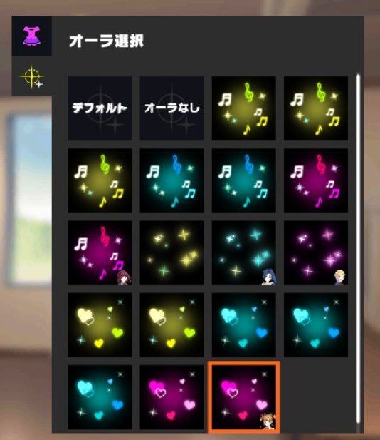 ①コーデモードで『ハート』または『音符』タイプのオーラを選択する