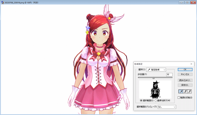 黒背景、白背景のそれぞれにて、許容量を最大値の半分よりわずかに少ない程度にして色域選択し、背景を消去する。