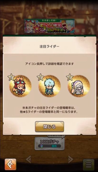 ガチャではオーブを消費して★3~★5のライダーを獲得することができます。初回は★5が確定の引き直しガチャが実装されるそうです。(★5は1体のみで2体は出ません)