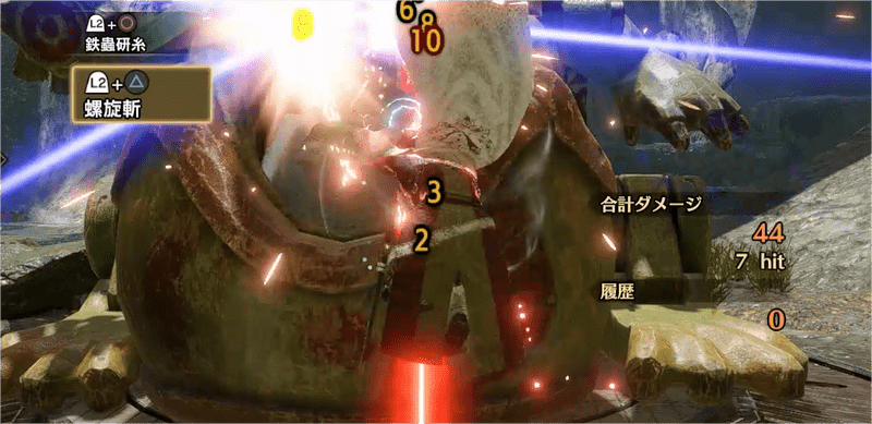 螺旋斬は弱点となる部位に当てることで追加攻撃が発生する性質が備わっています。肉質の硬い部位にヒットした場合は追加攻撃が発生せず、そのまま進行方向へ突き抜けてしまうので、注意が必要です。
