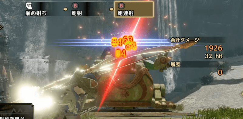 最大溜めの状態から剛射→剛連射と繋げることで、最大溜めの矢を3連続で放つことができます。