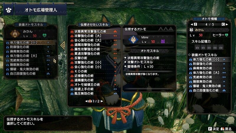 ライズ時点でオトモを厳選する意味はほぼありませんが、付け替えできるスキルを所持したオトモが必要になります。欲しいスキルを所持しているアイルーを見かけたら最低1匹は雇っておきまましょう。