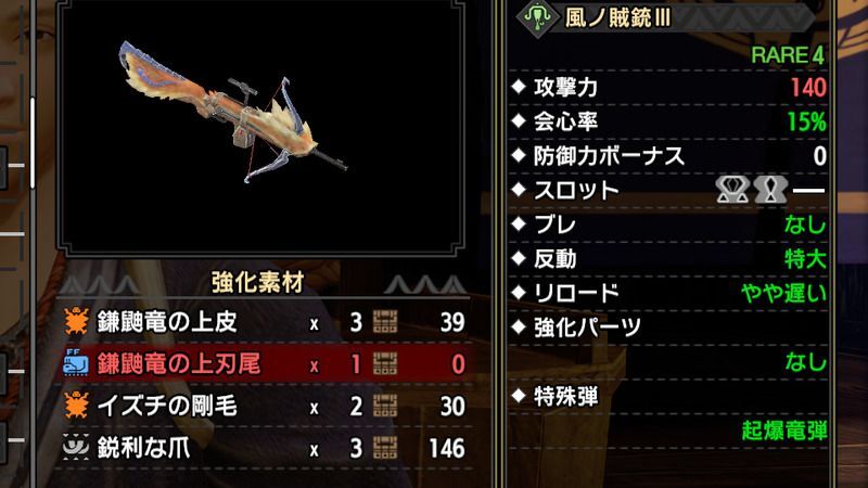| 風ノ賊銃Ⅱ ↓派生↓ 風ノ賊銃Ⅲ | ・貫通弾LV1と斬裂弾が速射 ・イズチ素材で作りやすい |