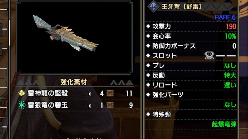 | 王牙弩【野雷】 | ・斬烈ライトの最終武器 ・斬烈弾を速射 ・スロット、会心率も優秀 |