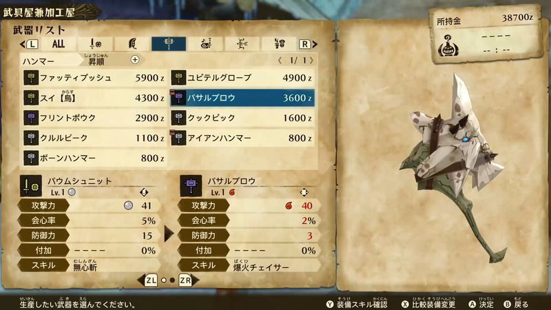 新しいモンスターを倒すごとに攻撃力が一番高い武器が加工屋に追加されていきます。お金に余裕があるなら新しいモンスターを討伐する度に加工屋に行き新たな武器を作るのがおすすめです。