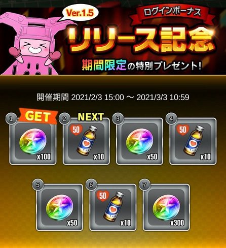 | 合計 | スターコイン(無償)×500 ガッツ回復ドリンク(50)×30 |