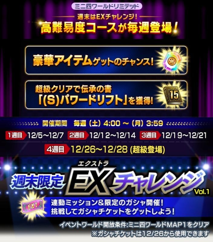 | EXチャレンジ Vol.1 4週目 超級をクリアしよう | EXチャレンジガシャチケット Vol.1×1 |