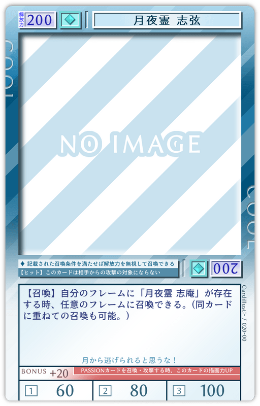 | 【召喚】自分のフレームに「月夜霊 志庵」が存在する時、任意のフレームに召喚できる。(同カードに重ねての召喚も可能。) |