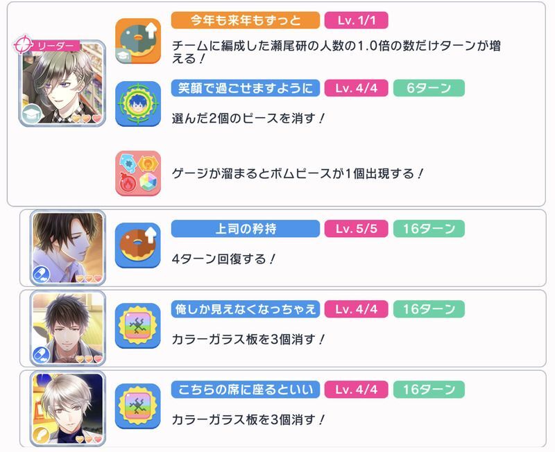 - リーダー:短いスキルターンで選んだピースを消せるカード。恒常SR【みんなと過ごすお正月】宝生潔など以下参照。スキル使用可になったらすぐに邪魔なレッドカーペットを縮めるか、緑の乗っているカラーガラス板を消すことができます。タイミングが良ければ、クリアまでに複数回スキルを使うことができます。