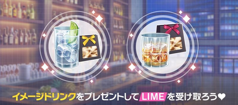 ④昨年のバースデーLIME(トーク)を受け取るのに必要だったプレゼントアイテム【SR】◯月◯日のイメージドリンクは、有償各キャラBDガチャの2ステップ目で獲得できるようになります。昨年のLIMEは、イメージドリンクをプレゼントした直後より着信可能となります。
