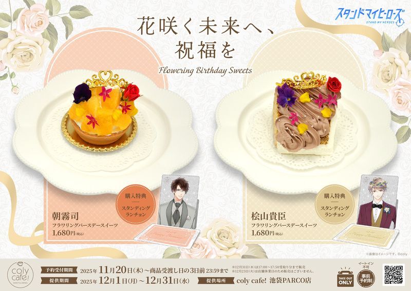 「朝霧司フラワリングバースデースイーツ」と「桧山貴臣フラワリングバースデースイーツ」につきましては、テイクアウト販売のみとなります。