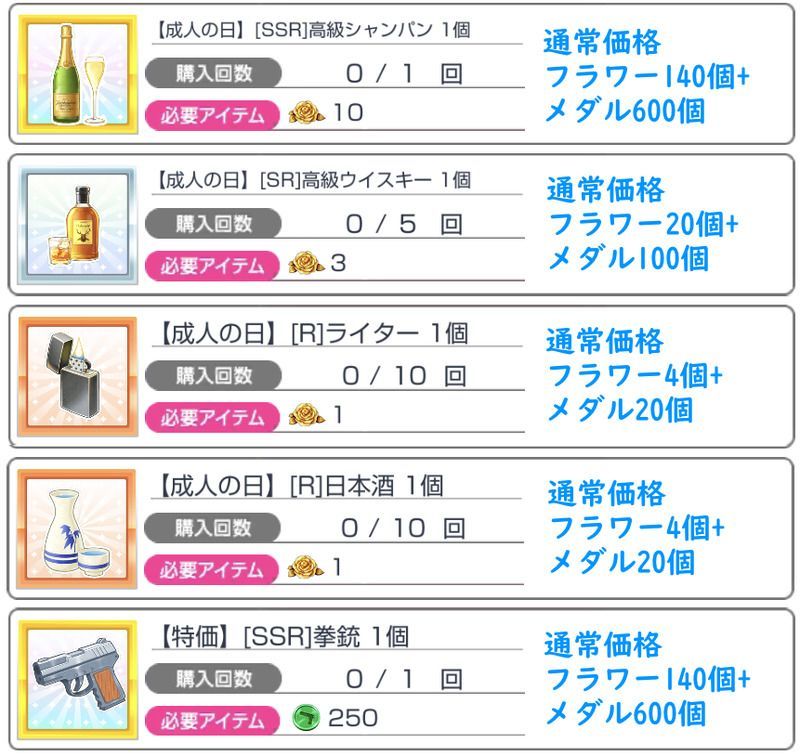 ![]() | チョコレートショップ 時間帯で変化あり フラワー×60 都築兄弟メダル×300 君への想いにリボンをかけて |