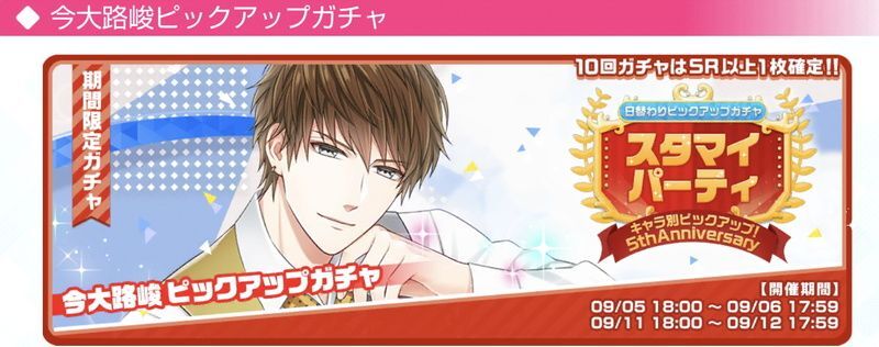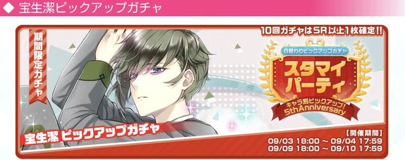 2021年9月の5周年「キャラ別ピックアップ!5th Anniversary スタマイパーティ」今大路峻PUのシミュレーターです。仕様上順番は決まっていませんが、1枚はSR以上確定枠です