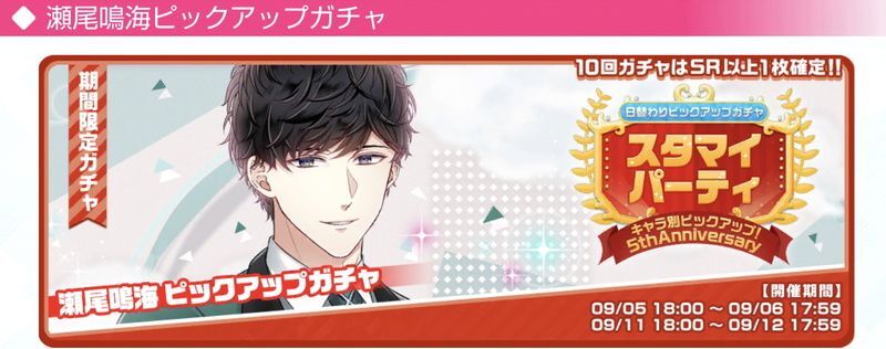 2021年9月の5周年「キャラ別ピックアップ!5th Anniversary スタマイパーティ」瀬尾鳴海PUのシミュレーターです。仕様上順番は決まっていませんが、1枚はSR以上確定枠です