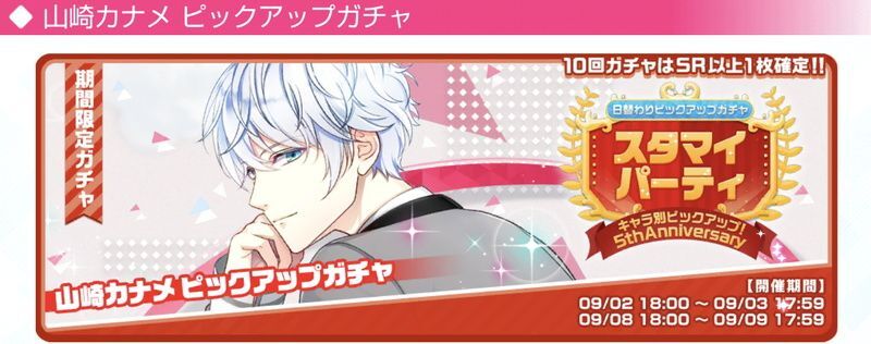 2021年9月の5周年「キャラ別ピックアップ!5th Anniversary スタマイパーティ」山崎カナメPUのシミュレーターです。仕様上順番は決まっていませんが、1枚はSR以上確定枠です