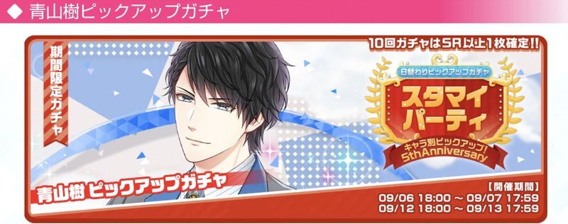 2021年9月の5周年「キャラ別ピックアップ!5th Anniversary スタマイパーティ」青山樹PUのシミュレーターです。仕様上順番は決まっていませんが、1枚はSR以上確定枠です