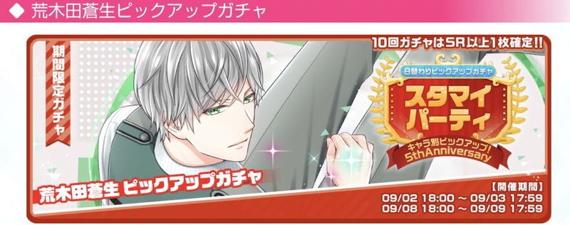 2021年9月の5周年「キャラ別ピックアップ!5th Anniversary スタマイパーティ」荒木田蒼生PUのシミュレーターです。仕様上順番は決まっていませんが、1枚はSR以上確定枠です
