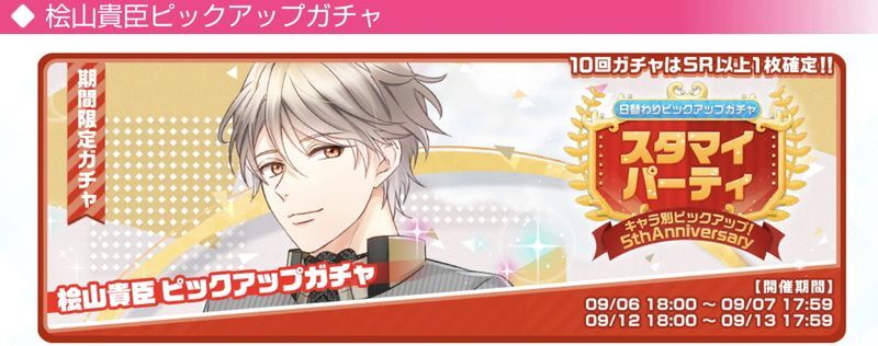 2021年9月の5周年「キャラ別ピックアップ!5th Anniversary スタマイパーティ」桧山貴臣PUのシミュレーターです。仕様上順番は決まっていませんが、1枚はSR以上確定枠です