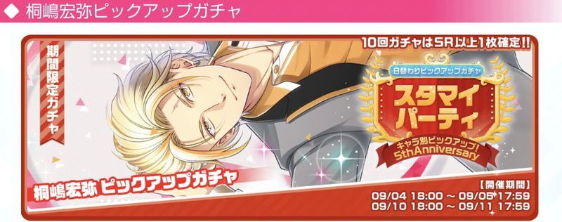 2021年9月の5周年「キャラ別ピックアップ!5th Anniversary スタマイパーティ」桐嶋宏弥PUのシミュレーターです。仕様上順番は決まっていませんが、1枚はSR以上確定枠です