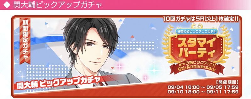 2021年9月の5周年「キャラ別ピックアップ!5th Anniversary スタマイパーティ」関大輔PUのシミュレーターです。仕様上順番は決まっていませんが、1枚はSR以上確定枠です