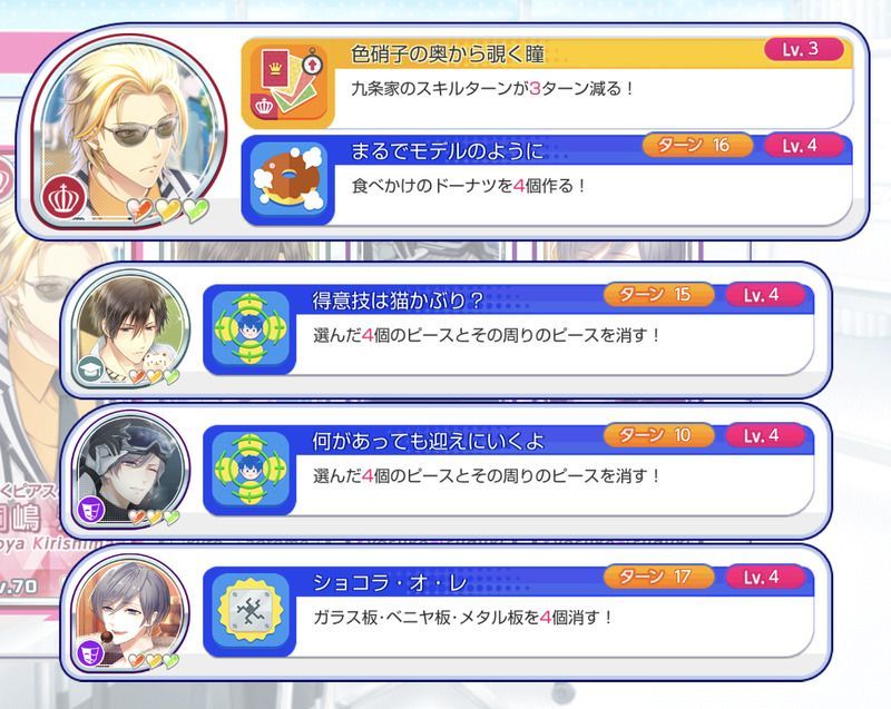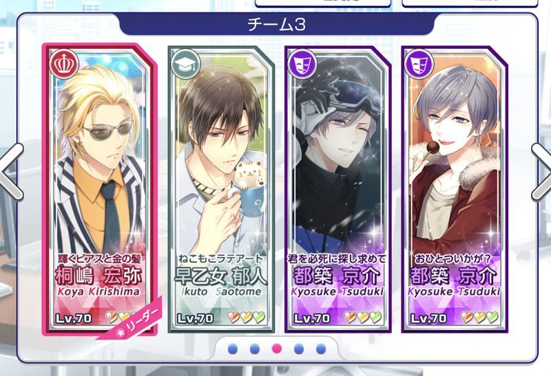 例えばSR【上司の本心】関大輔のリーダースキルでマトリのスキルターン減と回復、残りにマトリの雲消しである【照れ臭いオオカミ課長】関大輔・【真っ赤な果実を召し上がれ】青山樹・【愛の証明をしよう】由井孝太郎の編成などだと周回も余裕です。