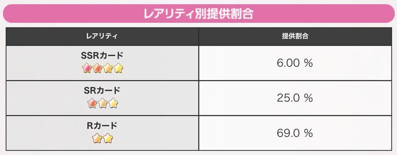 - 同一レアリティのカードの提供割合は、排出率アップ中のカードを除き、均等に設定されています。