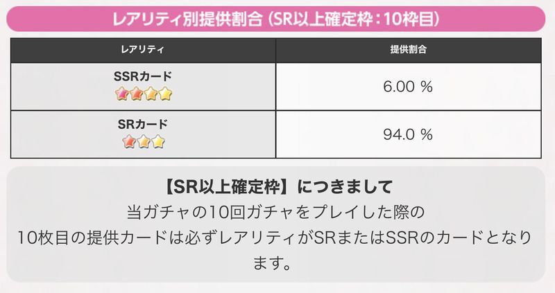 | ※同一レアリティのカードの提供割合は、排出率UP中カードを除き、均等に設定しています。 ※排出されるカードの一覧は「ガチャ詳細画面」からご確認ください。 |