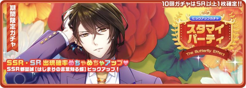 | ①スタマイパーティThe Butterfly Effect 都築誠ピックアッガチャ ②スタマイパーティThe Butterfly Effect 宮瀬豪ピックアッガチャ ③1回限定有償10回スタマイパーティThe Butterfly Effectガチャ |