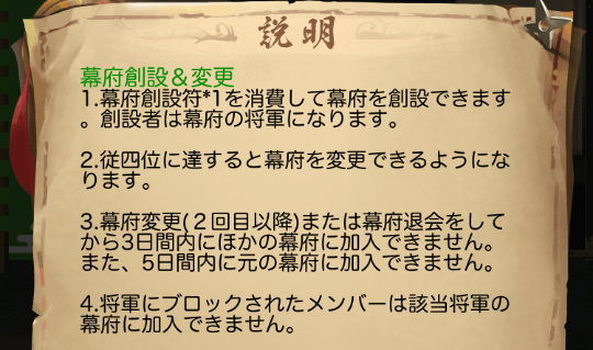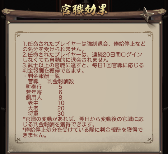 - これらの官職に任命されておらず20日間未ログインが続いた場合、自動的に幕府退会になります。