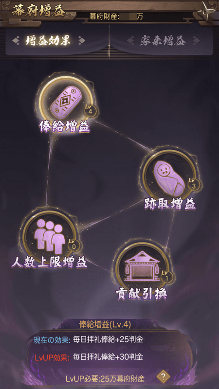 | 増益 Lv | ①跡 取り | 必要 財産 | ②俸給 | 必要 財産 | ③人数 上限 | 必要 財産 |