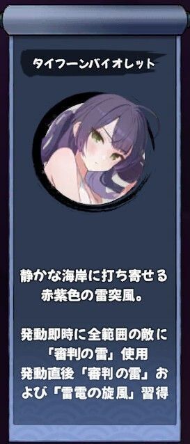 | 台風:バイオレット | ・戦場内のすべての対象に審判の雷を順次に発動し、攻撃します。 ・習得条件を無視し、「バイオレットサンダー」を即時「審判の雷」に、「旋風」を即時「雷電の旋風」に変更します。 |