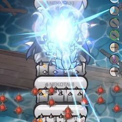 攻撃を受けると画面上部から召喚を開始して、中央あたりで止まります。射程と火力の高い編成によって早めに封印石を壊すことが必要です。壊した直後に召喚し直されることが続くようだと攻撃無効時間が延びるだけなので、難易度を下げるか、かなり良い引きでないと難しいかもしれません