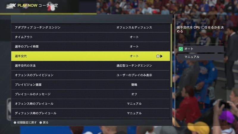 初期設定では全てオートになっています。選手交代やタイムアウトの判断が難しいと感じるなら全てオートにしておき、ゲームに慣れてきたら少しずつマニュアルに変更してみてみましょう。