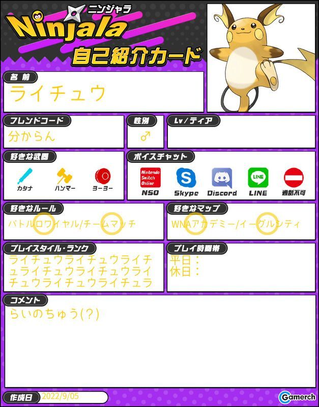 723年まえ ID:g7xb9v6jらいーこのがぞうあげる作ったwらいの自己紹介カードw