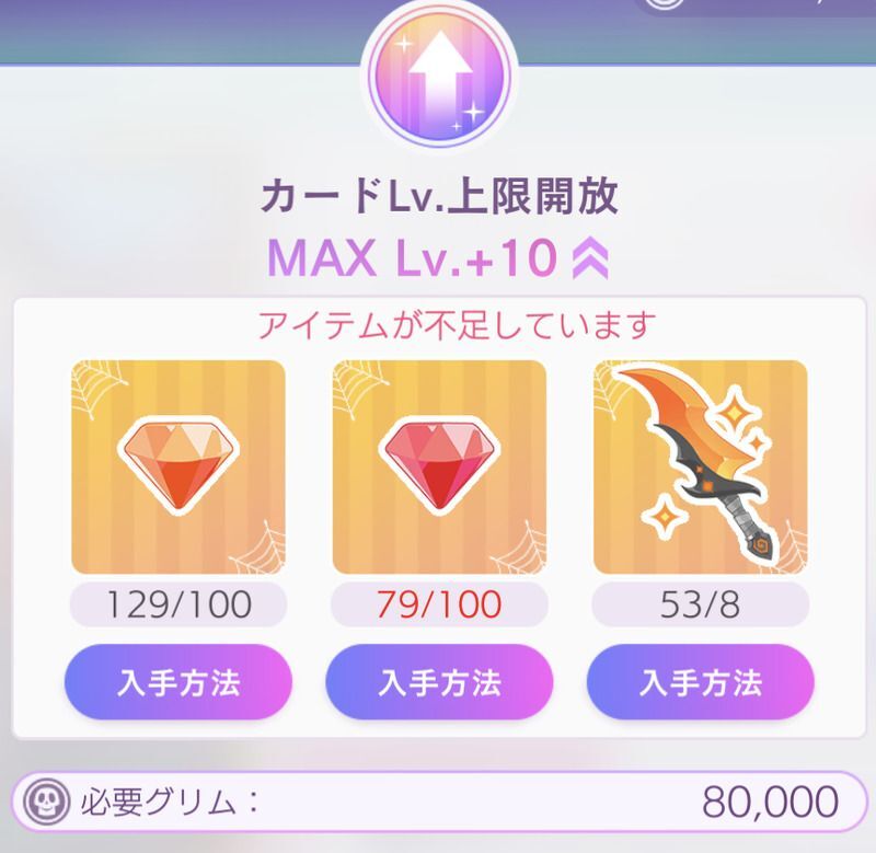 ![]() | ・反省会でのプレゼント ・イベントご褒美(リスト) ・アルバイト ・ガチャ(スキルMaxのカードが自動変換) |