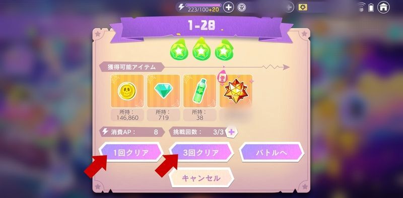 1度星2以上でクリアしたクエストはまとめて5回(ハードは3回)掃討することができるようになりますが、リザルト画面(グリム/ドロップアイテムとプレイヤー経験値のみ)しか出てこず反省会は発生しません。キャラカード経験値も入らないため早急にスタミナを消化したい時に使うようにしましょう。