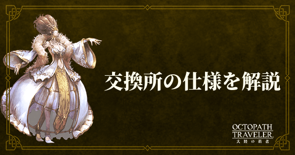 オクトパストラベラー大陸の覇者(オクトラアプリ)の交換所の仕様を掲載しています。交換所の場所や交換優先度などもまとめているのでぜひご覧ください。