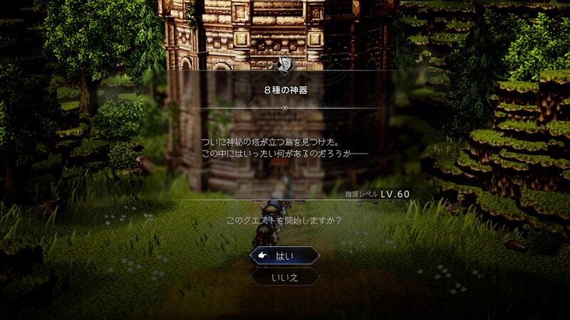 島の中にある塔の入口を調べると、クエスト「8種の神器」を開始するか選択画面が出ます。