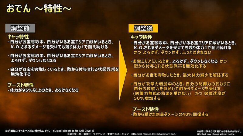 バウンティラッシュにて2025年11月11日に実施されるバランス調整の内容をまとめています。「九里大名 光月おでん」「鬼ヶ島討ち入り ロロノア・ゾロ」など4キャラの性能の変更点など気になる方はぜひご覧ください。