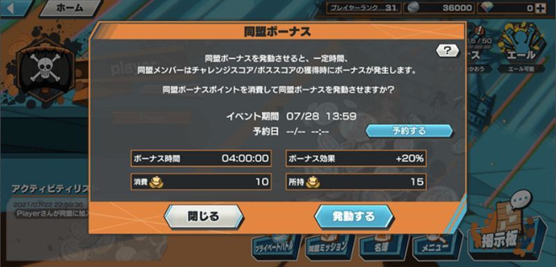 集めた同盟ボーナスポイントを使用し、同盟ボーナスを発動するとチャレンジスコア/ボススコア獲得量が増加します。