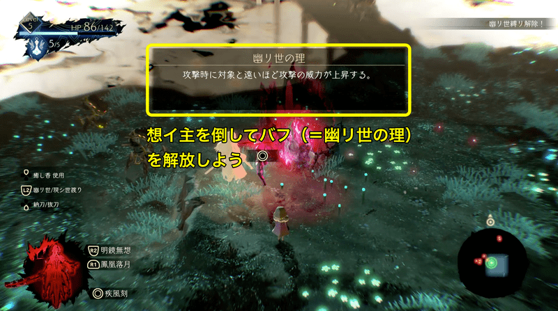 道中には必ず想イ主(サイズが大きく、周囲に白いもやがかかった敵)が出現する。想イ主を倒すと、幽リ世での行動範囲が広がり、「幽リ世の理」が解放される。「幽リ世の理」は、マップごとに異なったバフ・デバフを受ける効果のこと。