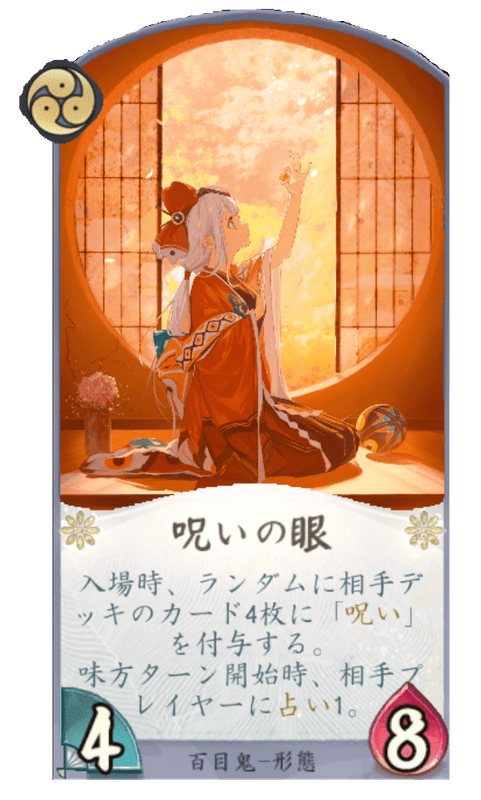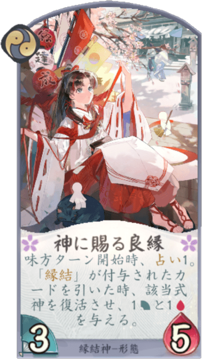縁結びのついたカードを引く度に気絶した式神は復活し、1:1バフがかかる。ターン開始時の1占いで引くカードの質を高められるのも強力だ。