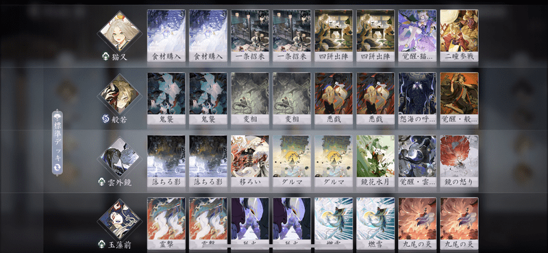 般若の占いで猫又の食材カードと召喚物カードをそろえ、コンスタントに打点5の召喚物を出して殴り勝つデッキだ。
