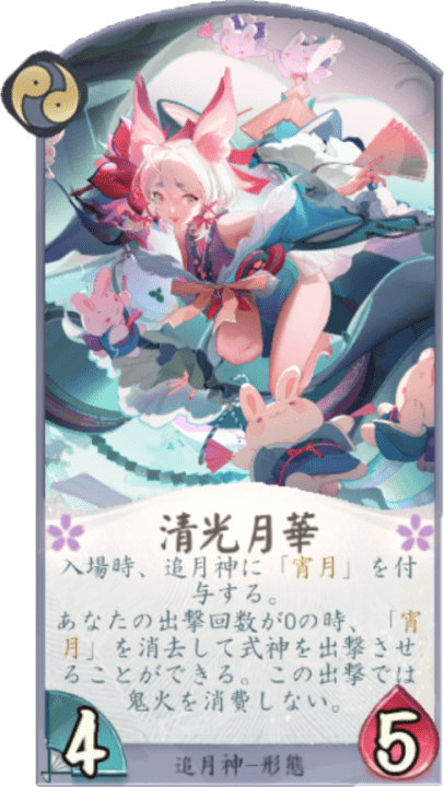宵月を消費することで式神を追加出撃させられる。御饌津との相性もよく、追月のカードをドローする度に攻撃できる強力なカード。