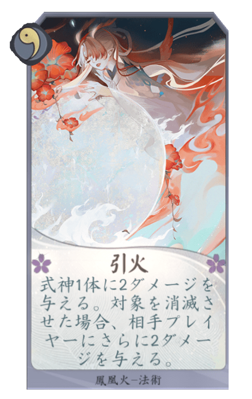 | 式神1体に2ダメージを与える。対象を消滅させた場合、相手プレーヤーにさらに2ダメージを与える。 | |||