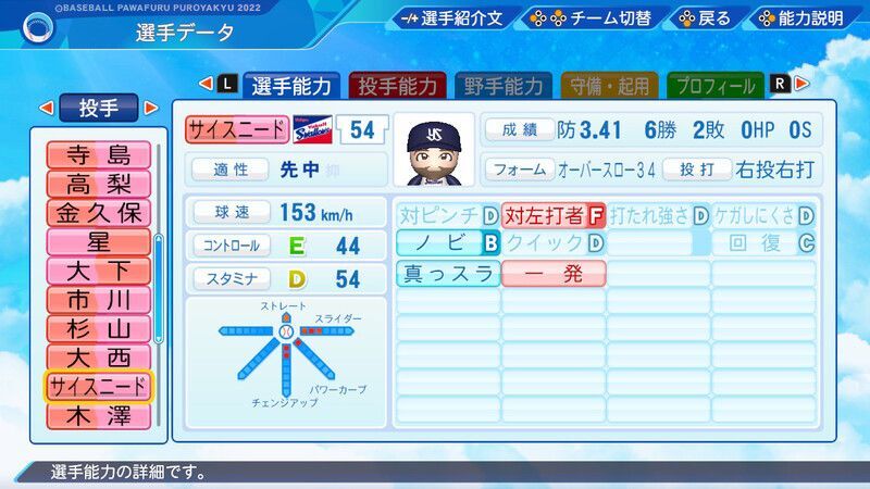 【パワプロ2022】のサイスニード(・)選手の投手能力、野手能力、フォームや投打などの基本情報に加え、特殊能力などの選手データをまとめています
