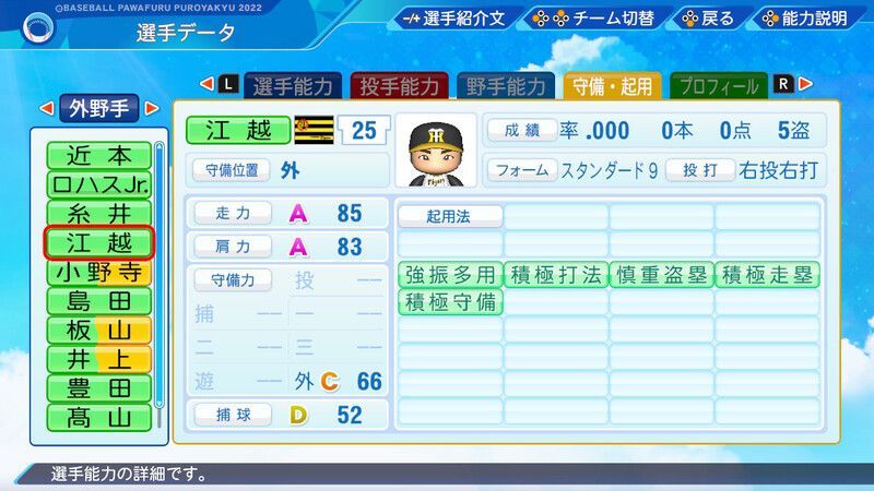 【パワプロ2022】江越 大賀(・)選手の野手能力、フォームや投打などの基本情報、特殊能力などの選手データをまとめています